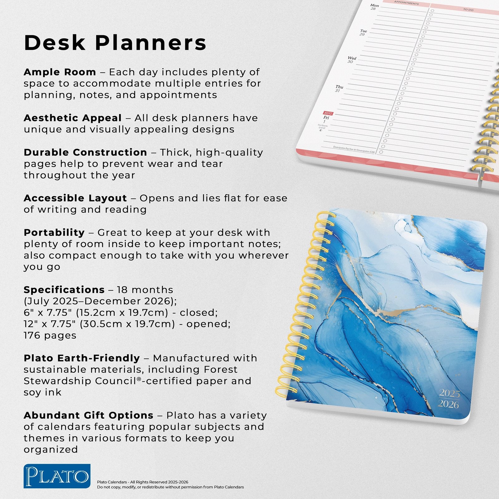 Who says organizing your time has to be drab and boring? The elegant, artistic designs in this gorgeous calendar bring life and light to even an ordinary day. Delicate, colorful patterns grace the covers and will brighten up your year! Busy people on the go rely on these premium, 18-month planners to stay organized. Measuring 6″ wide x 7.75″ tall, with pleasing, one-color interiors, the Plato desk planner offers more than the usual with a full 18 months’ worth of two-page weekly planning spreads. The practical yet unique planner layout makes daily, weekly, and monthly planning a cinch, while offering additional pages to jot down monthly goals, weekly to-do lists, daily appointments—and more! Sturdy covers are adorned with eye-catching foil highlights and smooth, radius corners. Wire bound and easy to carry in a purse, backpack, or briefcase.