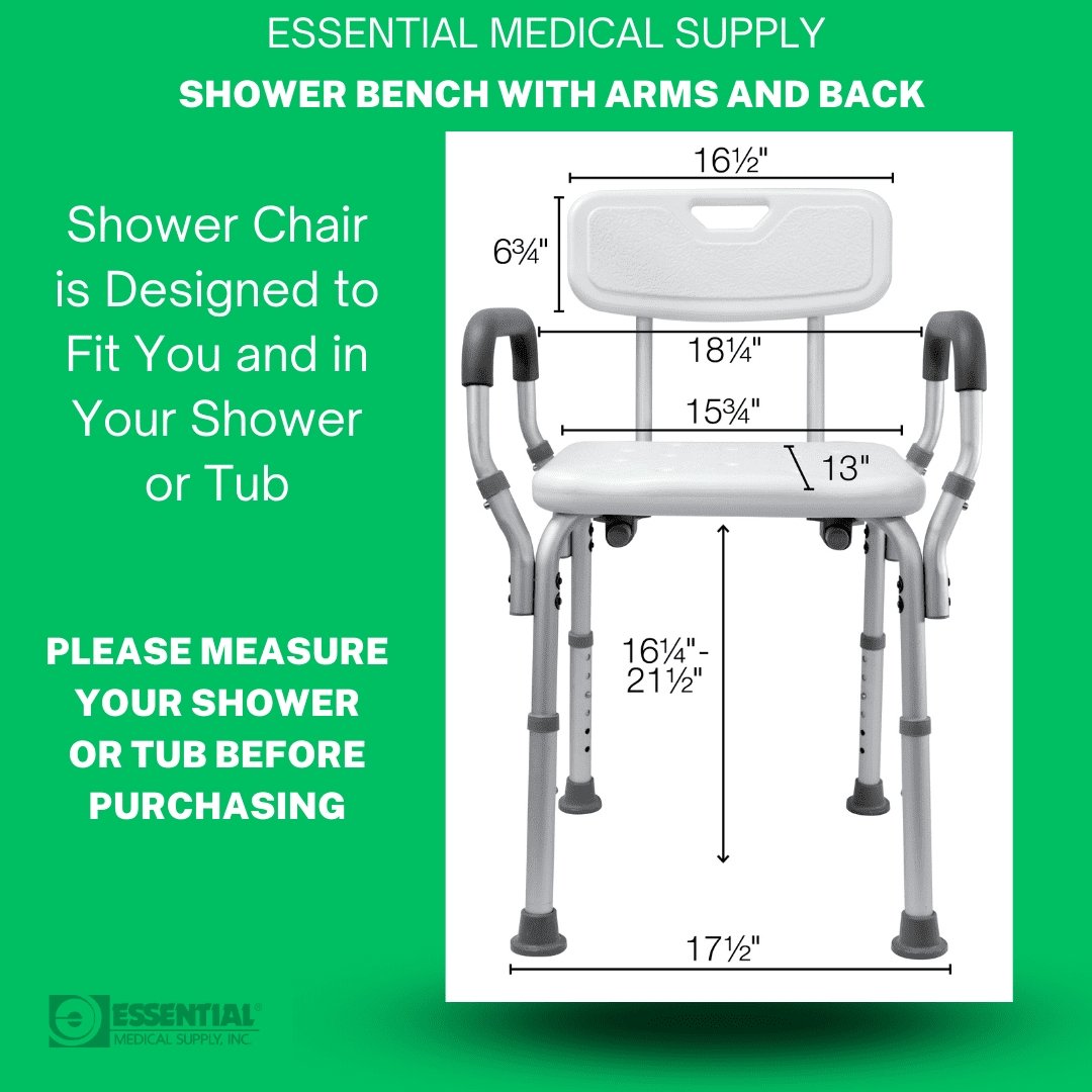 Experience a safe and comfortable shower with the Essential Medical Supply Height Adjustable Shower Chair. Designed for seniors and those with limited mobility, this chair provides easy support while bathing. With its adjustable height feature, aluminum frame, padded arms, contoured backrest and textured seat surface, this shower chair is perfect for use in both the bath and inside the shower. Shower Chair Features: Shower chair features padded removable arms for both comfort and safety for getting up and down. Bathroom chair also includes large, texturized seat and an aluminum, anodized frame to prevent rust and frame turning color. Padded arms make it easier for the users with limited leg strength to get out of the chair. Unit is seat height adjustable in 1″ increments from 16″ to 20″ and features a 13″ x 16″ seat. Will support up to 300lbs with easy tool free assembly with included visual directions. Specifications: Seat To Floor Height: 16 1/4″ – 21 1/2″ Seat Width: 15 3/4″ Seat Depth: 13″ Overall Width: 20″ User Weight Limit: 300 Ibs Back Dimensions: 16½” x 6 3/4” Width Between Arms: 18 1/4” Overall Depth: 19″ Overall Height: 28″ – 32″ Depth at Bottom of Tips: 15½”