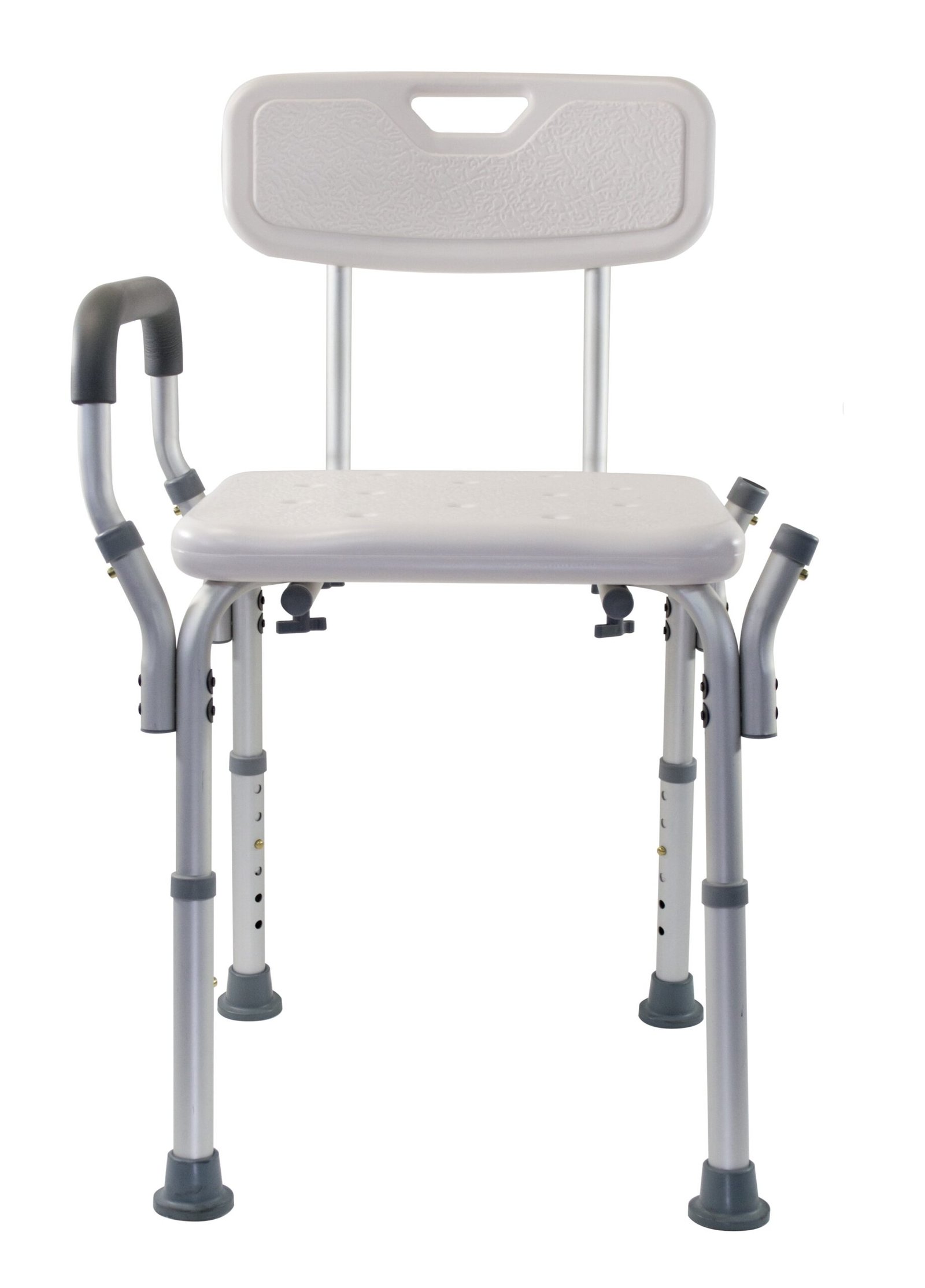 - SIT COMFORTABLY AND SECURELY – Bath chair with back features a large, texturized 13″ x 16″ seat with 18 1/4″ between the arms. Each shower seat has drain holes to prevent water build up while seated and is texturized to prevent slipping inside the shower or bathtub. Padded aluminum arms on the shower chair allow to rest while showering or bathing.