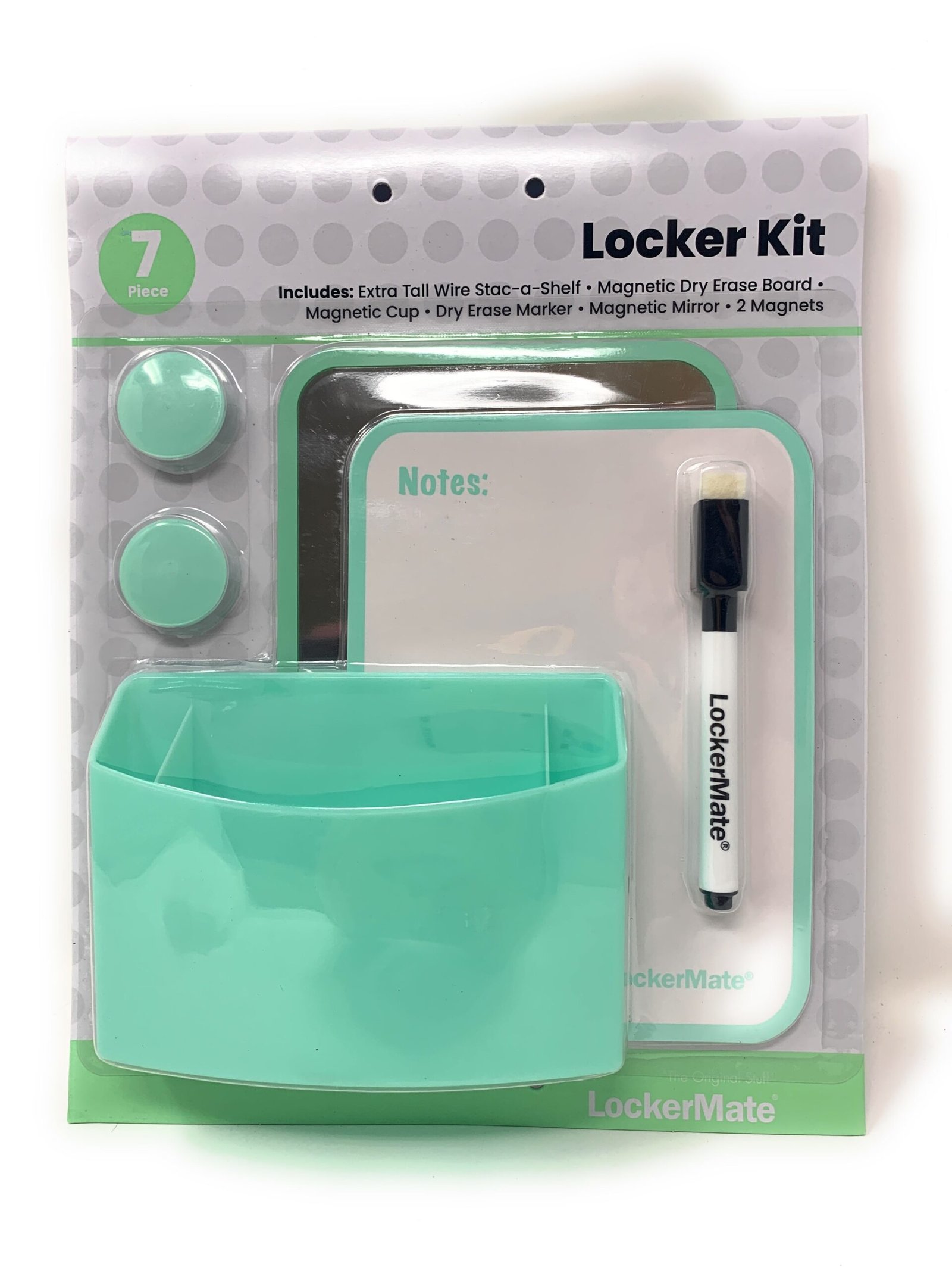 Keep your student organized with this Seven-Piece Locker Kit. This pack comes with everything they need to start school in style. Space is often limited in lockers, so the extra wire shelf adds more room for school supplies and books. The dry-erase board and two magnets make it easy to jot down reminders and keep track of important papers. This locker shelf kit even includes a mirror and storage cup. Lockermate is the leading innovator in organizational solutions for the school, home and office. Our team is dedicated to creating quality products with the cutting edge features, enhanced safety, and progressive design. Customize and personalize your school locker now.