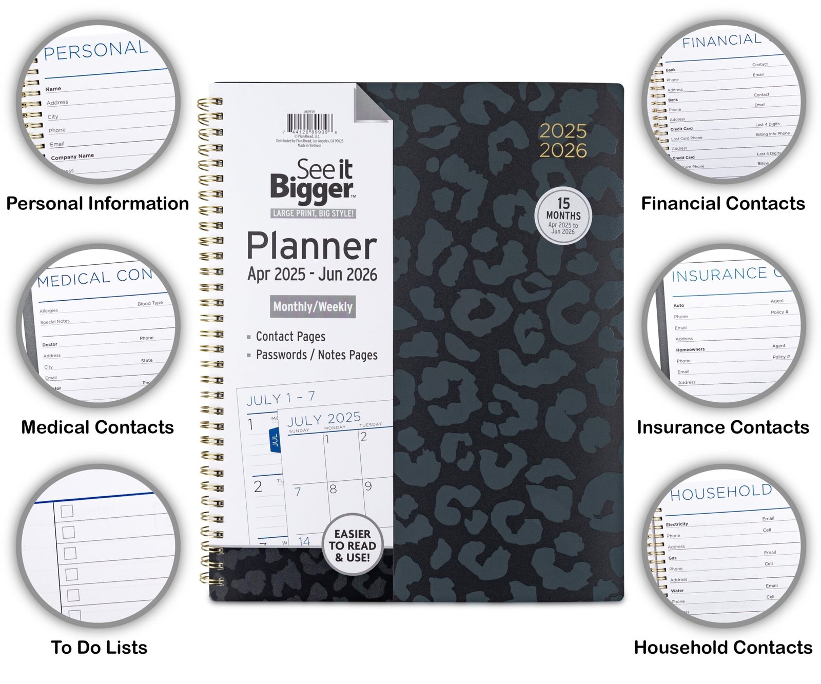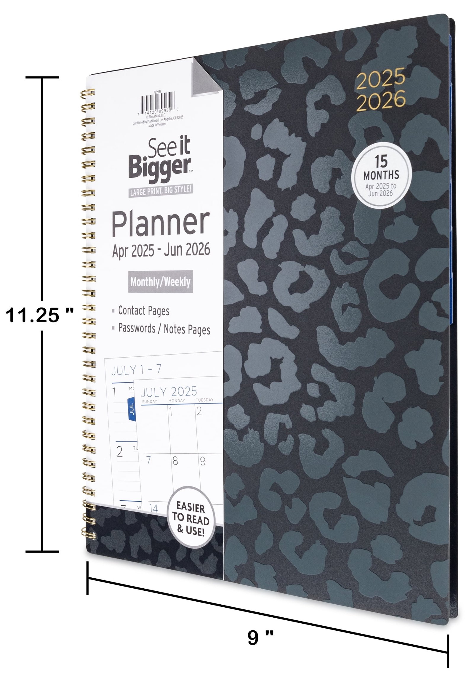See it Bigger Monthly Weekly Planner Large (9.25″ x 11″) Black Leopard, 15 month, Apr 2025-Jun 2026