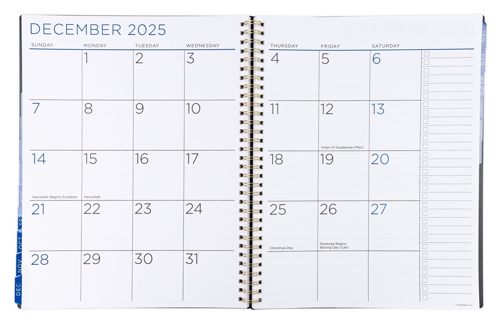 See it Bigger monthly weekly dated planner covers 15 months from April 2025 to June 2026, featuring monthly and weekly dated pages. Laminated monthly tabs allow for quick access to separate monthly calendars that open flat in side-by-side pages. A defined space along the right margin provides room for notes and tasks. Weekly view pages so each week may be viewed in its entirety. Monthly view pages show Yearly Reference Calendars and Holiday Listings making future planning simple. A dedicated Note, Contact, and Password Record Pages for easy retrieval.