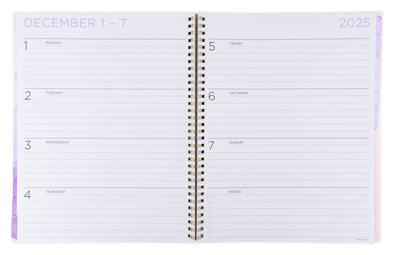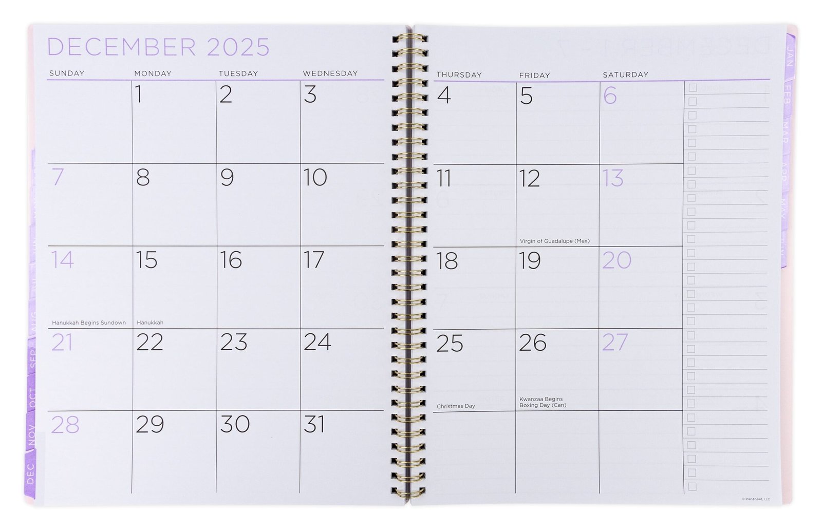 The See it Bigger planner covers 15 months from April 2025 to June 2026, featuring monthly and weekly dated pages. Laminated monthly tabs allow for quick access to separate monthly calendars that open flat in side-by-side pages. A defined space along the right margin provides room for notes and tasks. Weekly view pages so each week may be viewed in its entirety. Monthly view pages show Yearly Reference Calendars and Holiday Listings making future planning simple. A dedicated Note, Contact, and Password Record Pages for easy retrieval.