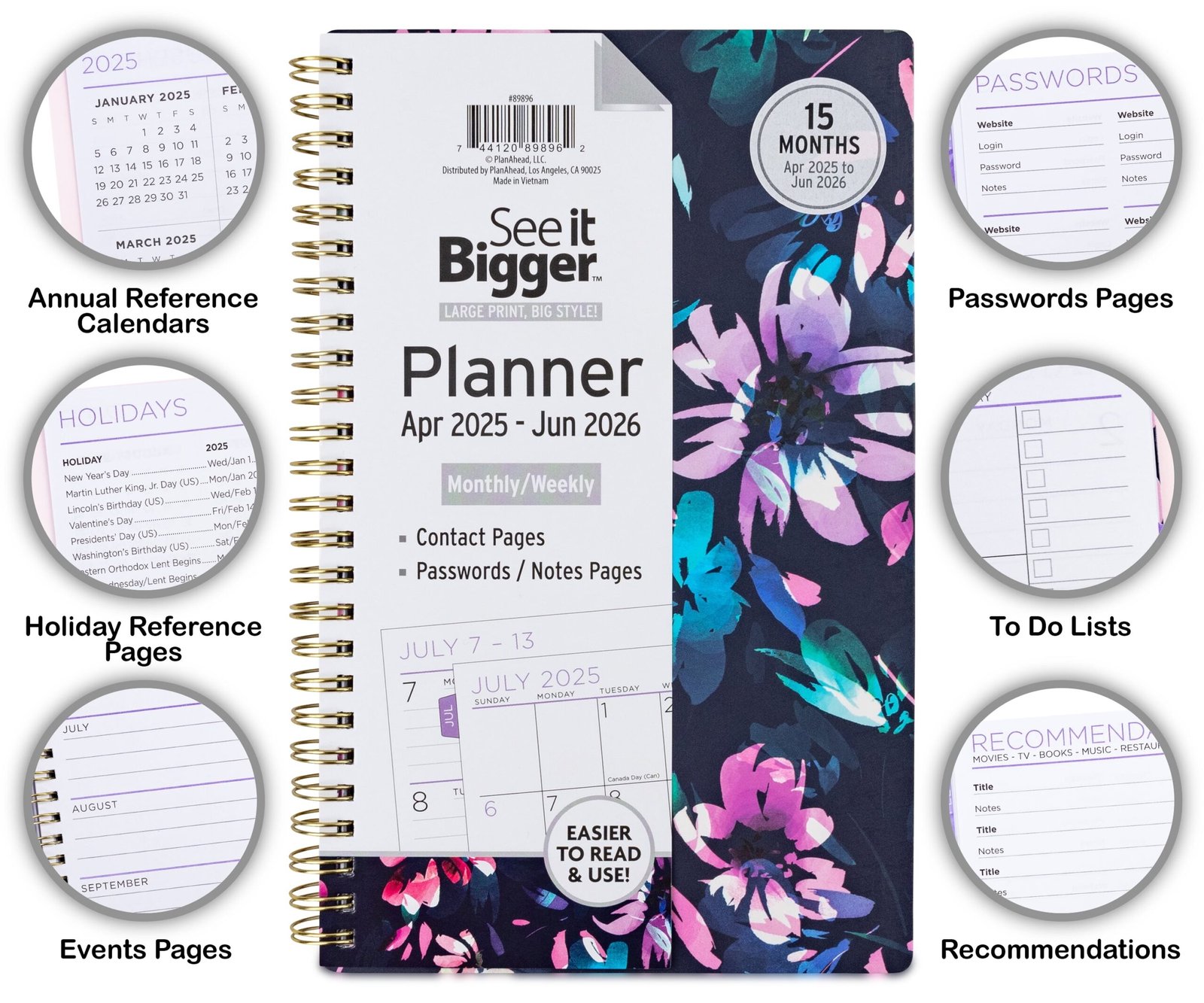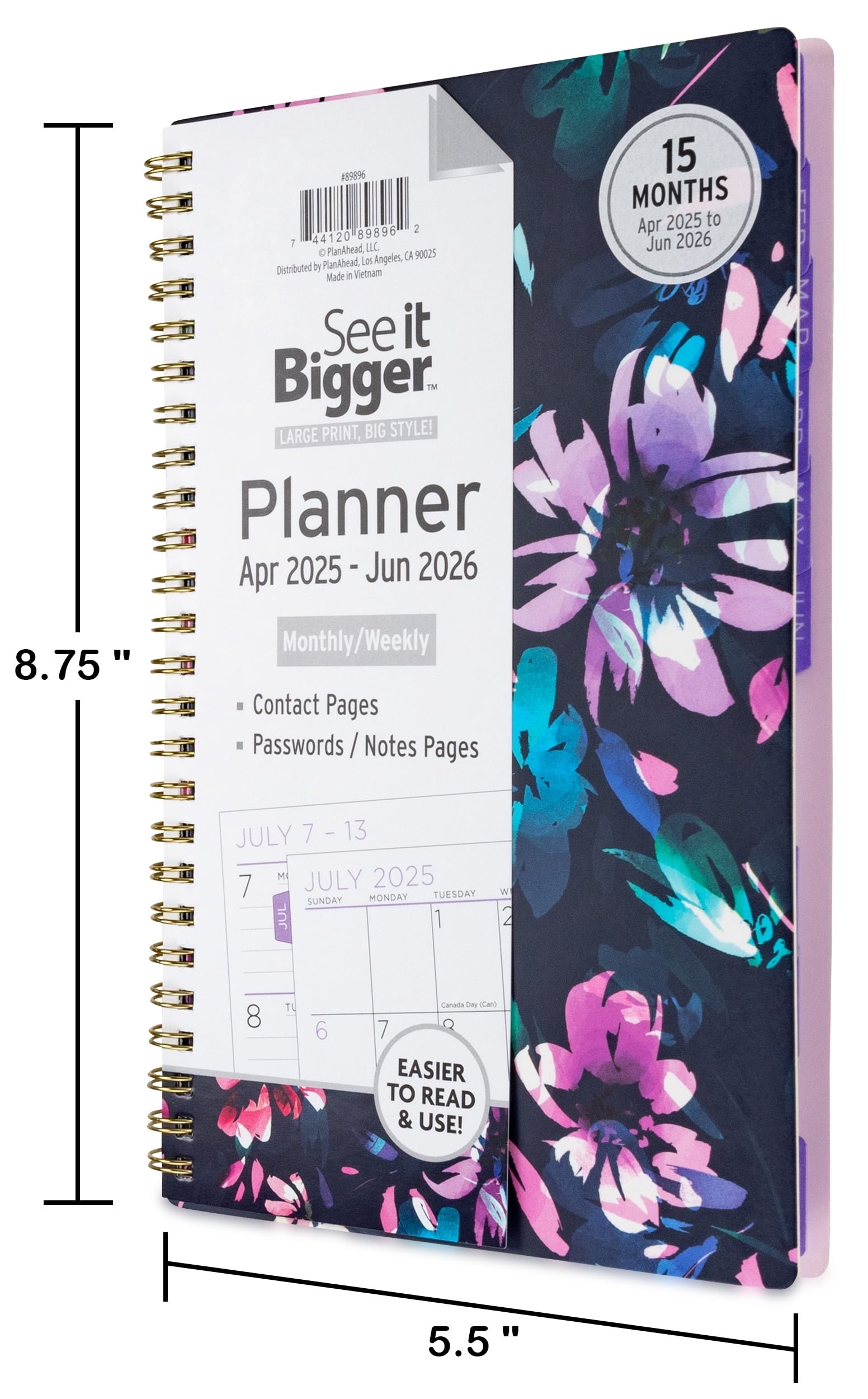 The See it Bigger planner covers 15 months from April 2025 to June 2026, featuring monthly and weekly dated pages. Laminated monthly tabs allow for quick access to separate monthly calendars that open flat in side-by-side pages. A defined space along the right margin provides room for notes and tasks. Weekly view pages so each week may be viewed in its entirety. Monthly view pages show Yearly Reference Calendars and Holiday Listings making future planning simple. A dedicated Note, Contact, and Password Record Pages for easy retrieval.