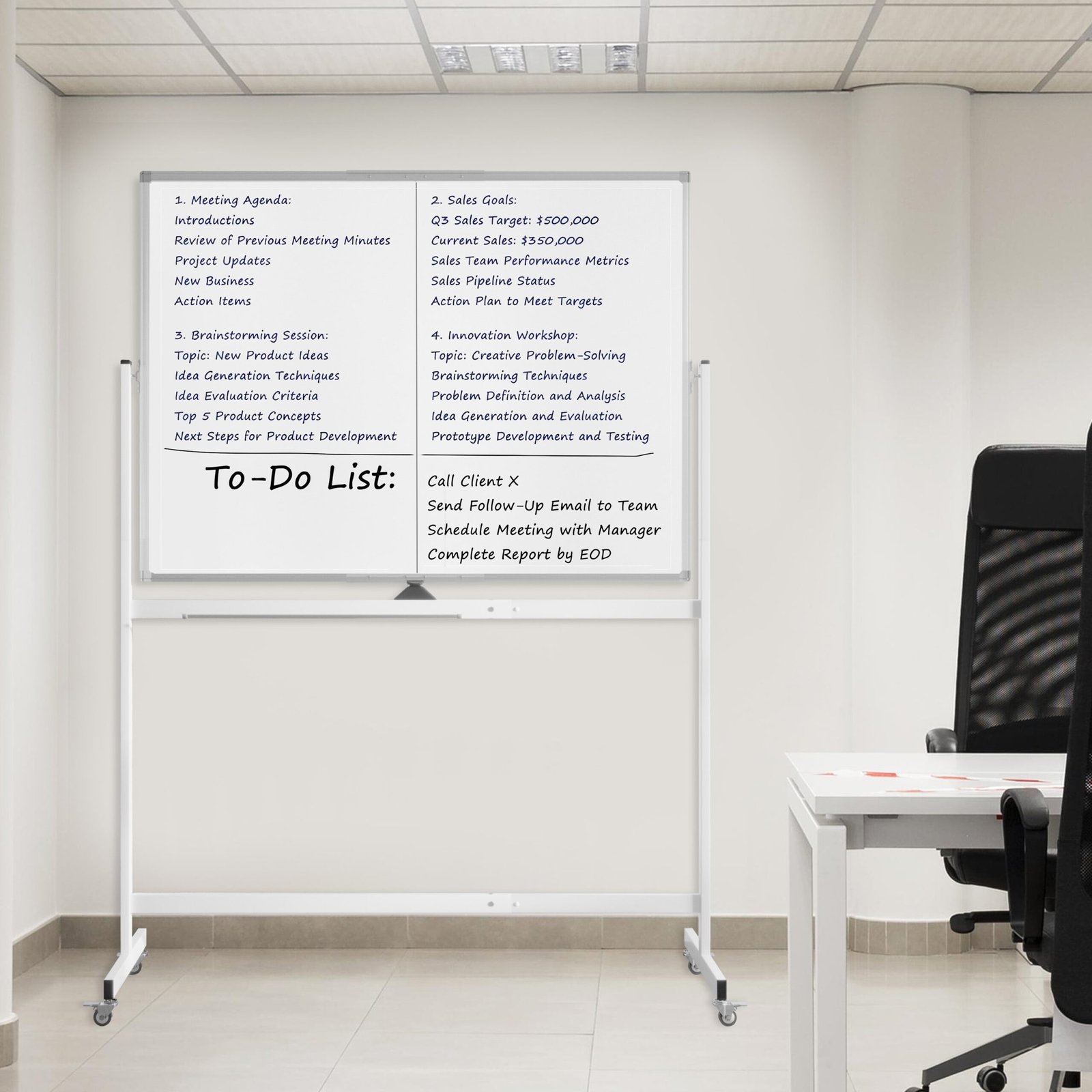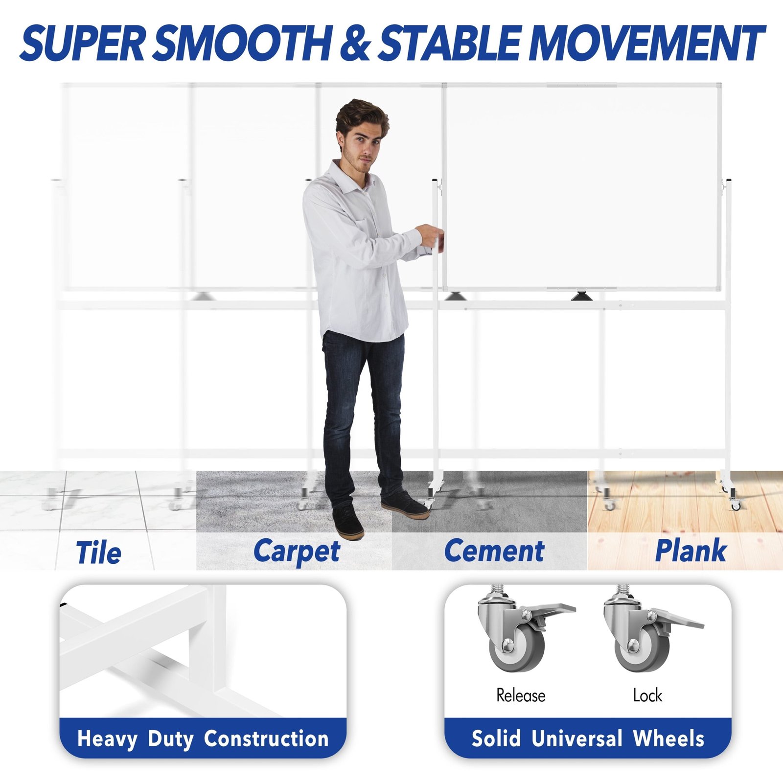 Product details: Inspire your creativity and imagination with our whiteboard! Our 48 x 36 inches double-sided mobile whiteboard fits into almost any space whose extra-large flat surface provides plenty of space for your ideas, teaching, or work presentations. And if one side is not enough to organize your ideas, you can flip the magnetic double-sided dry erase board with the ease of your hand and continue to write down your thoughts on the other side. The high-quality surface offers a smooth writing experience, being easy to wipe down without leaving marks. Designed with 4 easy-rolling caster wheels, the large mobile dry erase board can be moved easily in any location you need. Our large magnetic rolling whiteboard is made of the highest quality materials which can highly improve your productivity!