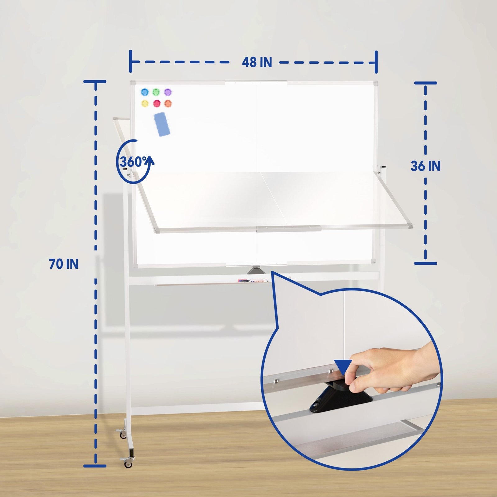 - Double-sided Whiteboard: The dry erase board is double sided and reversible design, press the button and flip the whiteboard to maximize writing space, the buckle can be locked the board in place to maximize stability.