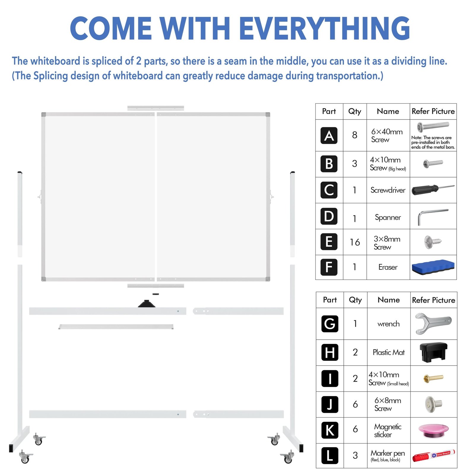 - Easy To Assemble & Accessories: Easy assembly without any prior DIY experience, with assembling instruction sheet & tools included. Complete writing and erasing accessories, holder tray and magnets included.